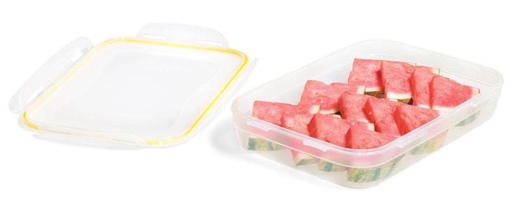 Dózy Lock & Lock "Easy Match" obdĺžnikové sú bezpečné a funkčné nádoby vyrobené z kvalitného plastu, ktorý je trvanlivý a odoláva vysokým teplotám. Tieto dózy sú 100% vzduchotesné a tým zabezpečujú dlhodobú čerstvosť uchovávaných potravín a sú vynikajúce aj z hľadiska uchovania vône (arómy). Štyri pohyblivé "klipy" zaisťujúce kryt sú odolné proti opotrebeniu. Nádoby majú špeciálne upravené vonkajšie dno tak, aby sa mohli bezpečne stavať na seba a nešmýkali sa. Dózy Lock & Lock možno použiť v chladničke, v mikrovlnke, v mrazáku aj v umývačke riadu. Dózy Lock & Lock prešli prísnymi hygienickými skúškami a zodpovedajú najprísnejším predpisom. Objem 3,4 l. Farba číra, žltá.