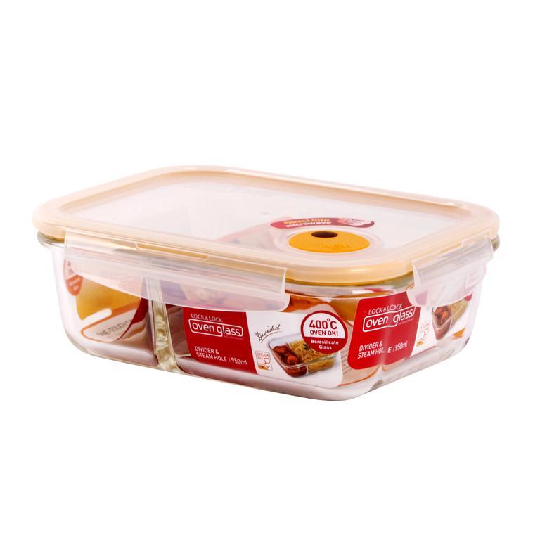 Dóza na potraviny Lock s priehradkou vo vnútri na rozdelenie potravín. Dóza je vhodná na uchovávanie a prenášanie potravín. Borosilikátové sklo je odolné až do teploty 400 °C. Dóza je 100% vzduchotesná a tým zaisťuje dlhodobú čerstvosť uchovávaných potravín. Je vynikajúca aj z hľadiska uchovávania vône (arómy). Plastové viečko s otvorom na únik pary. Štyri pohyblivé klipy na viečku sú odolné proti opotrebeniu. Vhodná do umývačky riadu aj mikrovlnnej rúry. Jedlo možno ohrievať v mikrovlnnej rúre s viečkom až do teploty + 100 °C, pokiaľ je otvorený otvor na únik pary. Objem 950 ml. Farba číra.