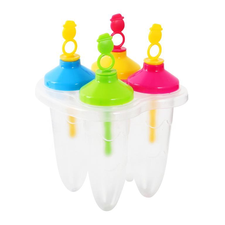 Formičky na tvorbu zmrzliny - sada 4 ks. Formičky sú skvelou pomôckou na vytvorenie domácich zmrzlín, sorbetov a pod. Jednoduché použitie v mrazničke, vyrobené z kvalitného plastu. Pre ľahšie vyklopenie zmrzliny najprv opláchnite vlažnou vodou. Rozmery - 11,5 x 10,5 x 15,5 cm. Objem jednej formičky 76 ml. Farba číra s farebnými držiakmi.
