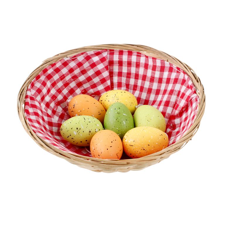 Veľmi pekný okrúhly košík z lúpaného prútia, ktorý je vo vnútri vystlaný kockovanou látkou (červeno bielou). Košík je v prírodnej farbe. Košík možno použiť na servírovanie pečiva alebo ako dekoráciu. Rozmery 24,5 x 7,4 cm.