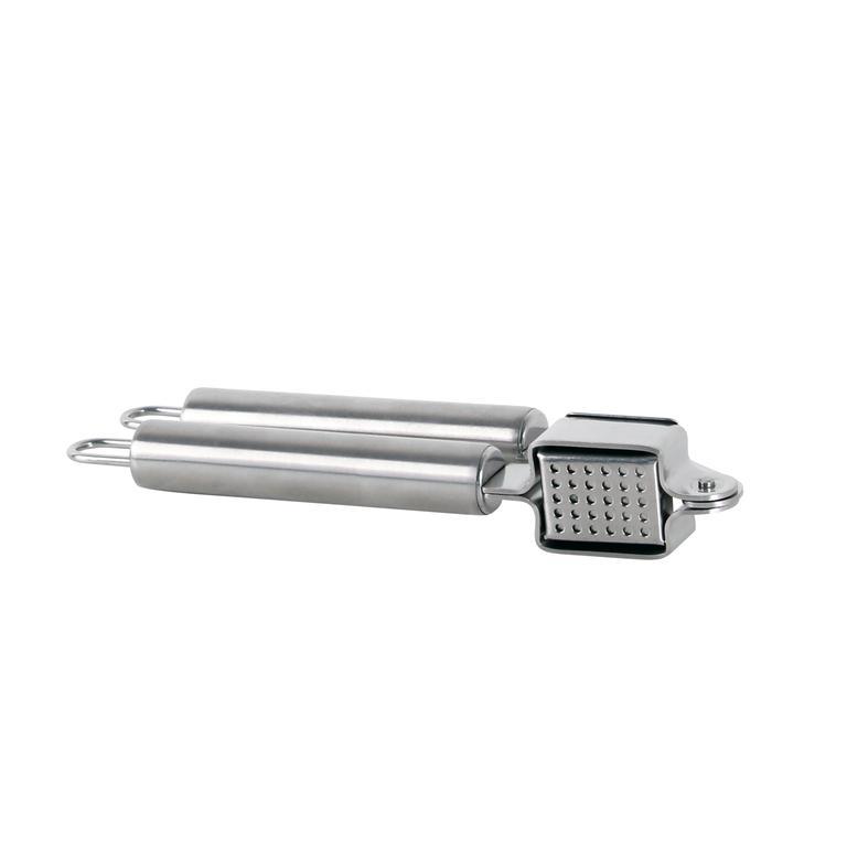 Celonerezový lis na cesnak s otvorom pre zavesenie na závesnú tyč. Rozmery - 19,5 x 5,7 x 3,4 cm. Farba strieborná.