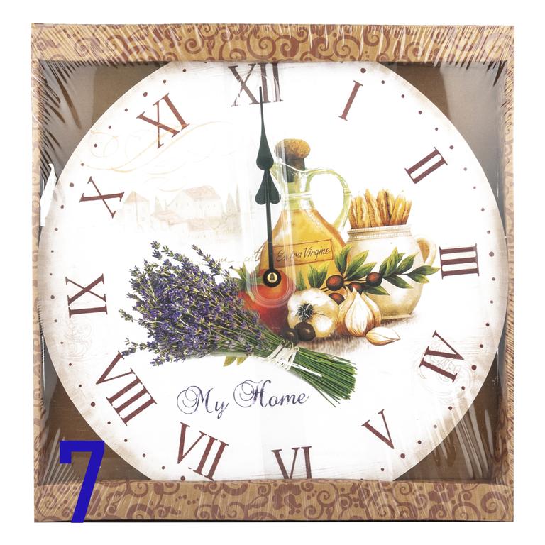 Nástenné hodiny sú krásnym dekoratívnym prvkom pre vašu kuchyňu. Hodiny sú vybavené strojčekovým systémom s plastovými ručičkami. Hodiny je možné zavesiť na stenu. Napájanie na 1 tužkovú batériu. Materiál - drevo, plast. Rozmery hodín - 34,2 x 0,5 cm. Rôzne moderné motívy.