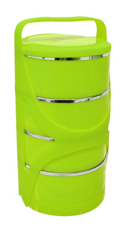 Praktický ľahký štvordielny obedár. Vhodný najmä pre ľudí, ktorí doma často nevaria a obedy si prinášajú z jedální alebo reštaurácií. Využiť ho môžu aj spoločnosti zaoberajúce sa rozvozom stravy (charitatívne domy, penzióny, vývarovne, obecné úrady). Materiál - nerez, plast. Rozmery 15,3 x 27 cm.