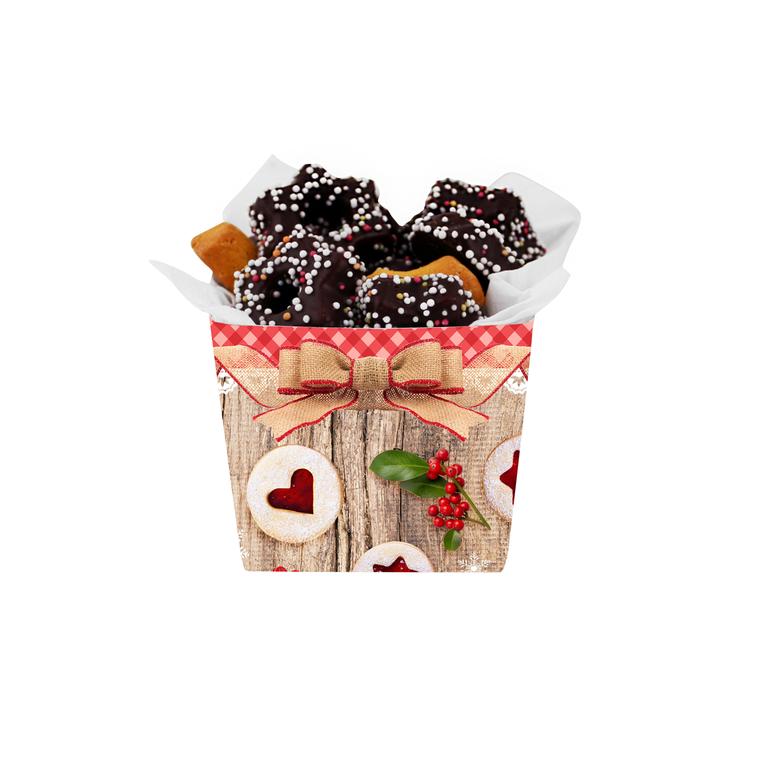 Papierová miska na cukrovinky s obľúbeným vianočným motívom linecké koláčiky. Balenie 4 kusy, materiál - papier, rozmery 8 x 8 x 7 cm.