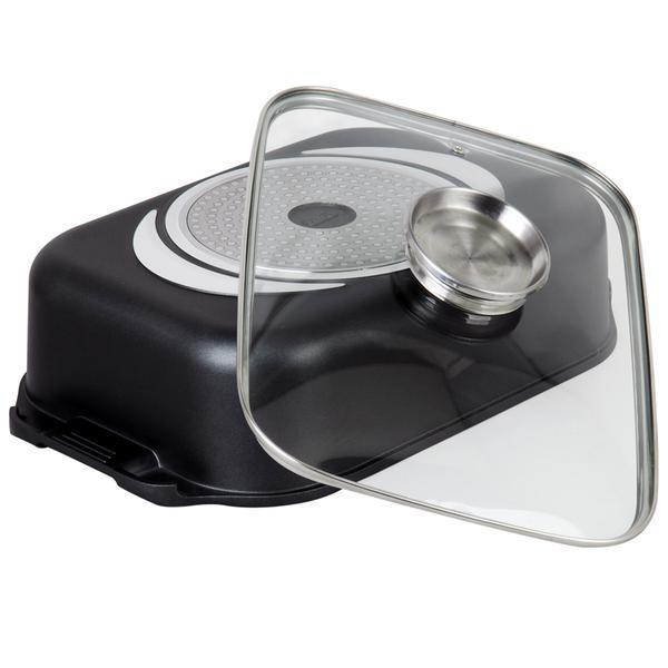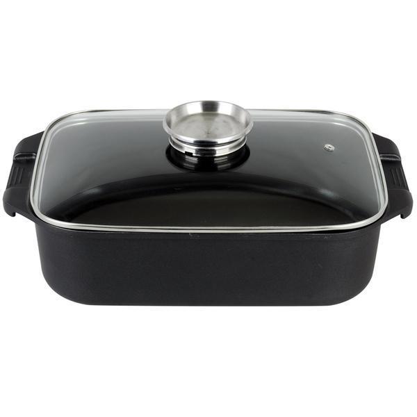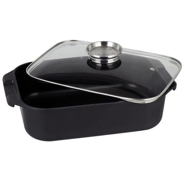 Pekáč so sklenenou pokrievkou patrí medzi klasické pomocníky v domácnosti. Pekáč je hliníkový s nepriľnavým povrchom a so sklenenou pokrievkou. Pokrievka má masívny nerezový úchyt a otvor na odchádzanie prebytočnej pary. Je vhodný na prípravu mäsa, zeleniny a ďalších pokrmov. Vonkajšie rozmery pekáča: 34,5x24,5x10cm. Vhodný na indukciu i do rúry (max. 240 ° C). Farba čierna.