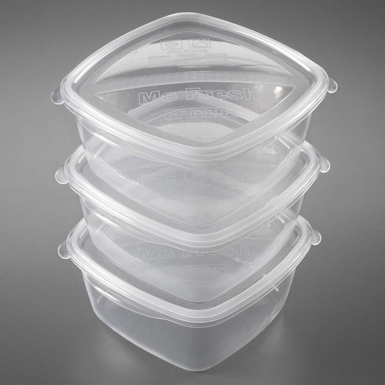 Súprava plastových dóz na potraviny, ktoré možno použiť do mikrovlnnej rúry, chladničky i mrazničky. Všetky 3 dózy v balení majú rovnakú veľkosť 17,5 x 17 x 8 cm, objem 1,2 l.