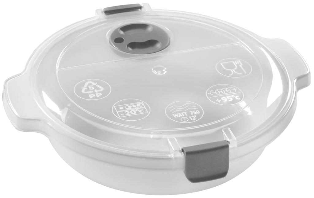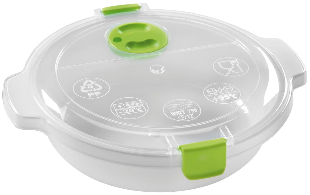 Plastová dóza s transparentným vekom je vynikajúca na rýchle rozmrazovanie, ohrievanie i varenie v mikrovlnnej rúre. V dóze môžete aj uchovávať hotové pokrmy v chladničke alebo mrazničke. Dóza má na veku otočný uzáver na odvod pary. Objem 0,7 l. Farebné prevedenie - zelená, modrá, taupe.
