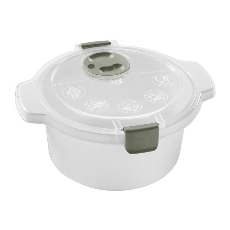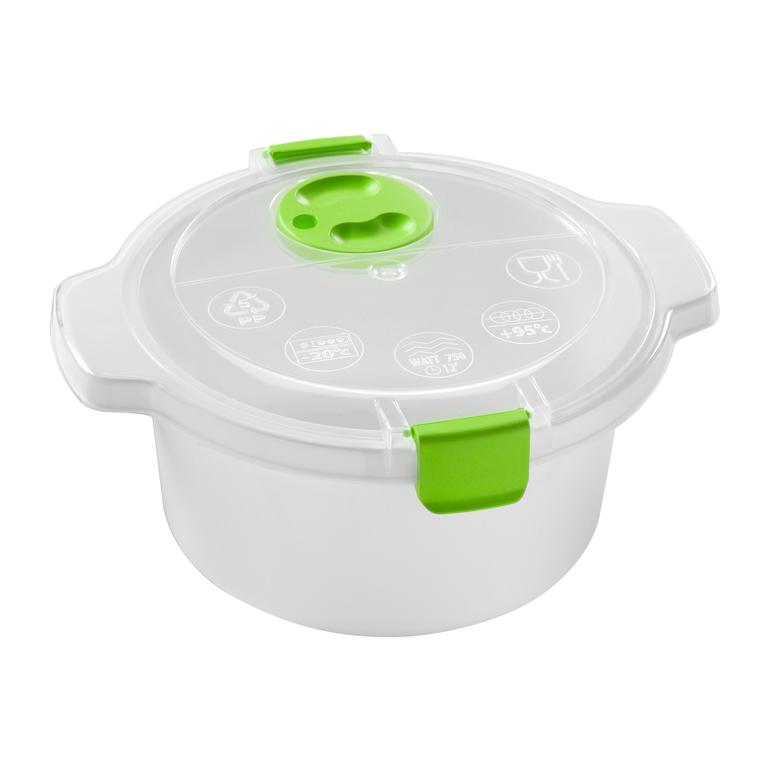 Plastová dóza s transparentným vekom je vynikajúca pre rýchle rozmrazovanie, ohrievanie aj varenie v mikrovlnnej rúre. Hotové pokrmy potom môžete v dóze uchovávať v chladničke alebo zmraziť. Na veku má dóza otočný uzáver pre odvod pary. Objem 0,8 l, rozmery 20 x 10 cm. Farebné prevedenie - zelená, modrá, taupe.