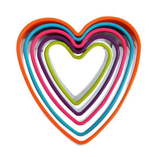 Plastové vykrajovače na cukrovinky v tvare srdca. V balení 5 ks - rôzne veľkosti. Assort farieb.