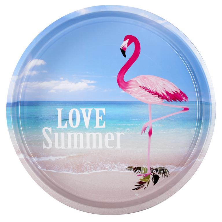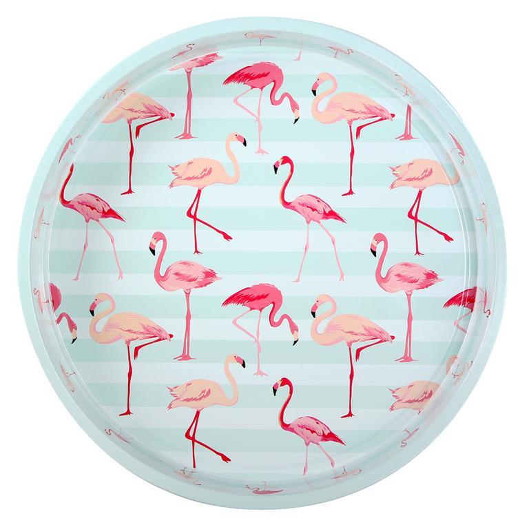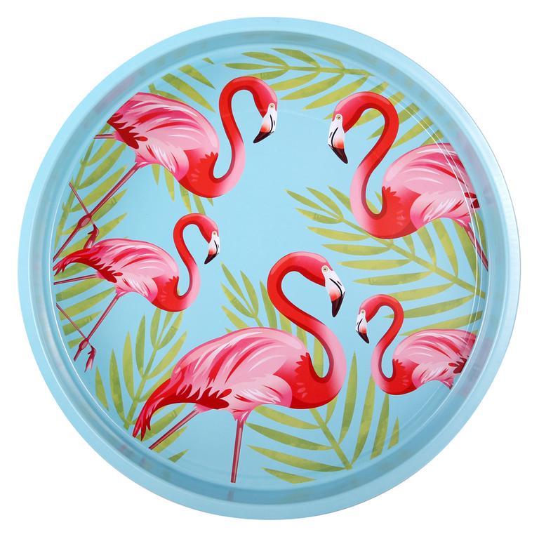 Plechový servírovací podnos s moderným a obľúbeným motívom plameniakov. Podnos je vhodný na servírovanie nápojov a pokrmov. Priemer 33 cm, výška 2 cm. Assort motívov plameniakov.