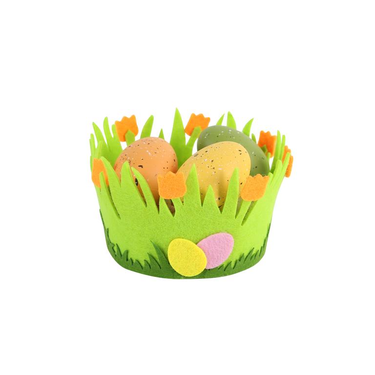 Plstený košík s veľkonočným motívom je vhodný na výzdobu vášho domova počas Veľkej noci. Do košíčka môžete vložiť vajíčka, umelé kuriatka či iné veľkonočné motívy a dekorácie. Rôzne motívy, rozmery 14 x 8 cm.