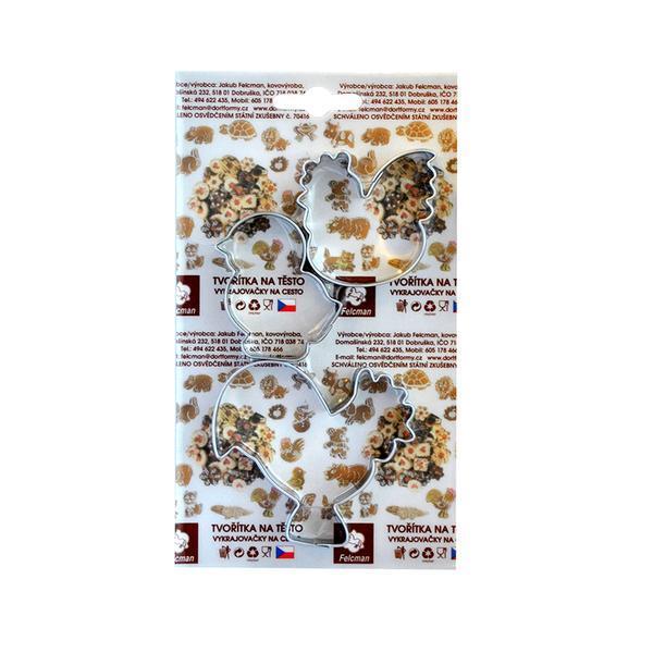 Veľkonočná sada formičiek. Vykrajovače sú vyrobené z pocínovaného plechu. Vhodné na cukrovinky, medovníčky, poťahové alebo modelovacie hmoty. Vykrajovače sú od českého výrobcu a spĺňajú všetky predpísané normy. Sada obsahuje 3 ks: kohútik, sliepočka, kuriatko.