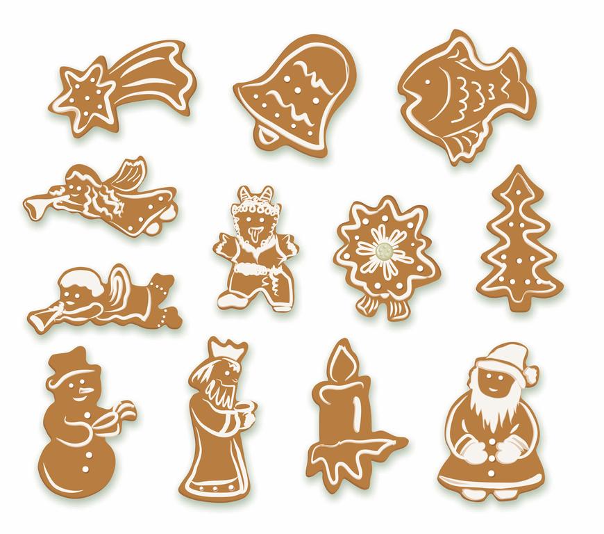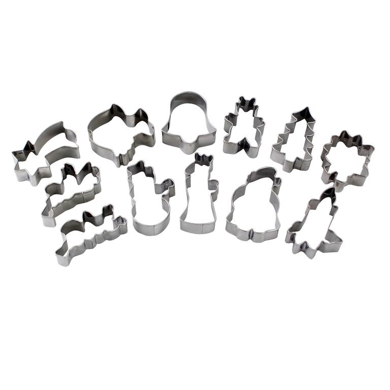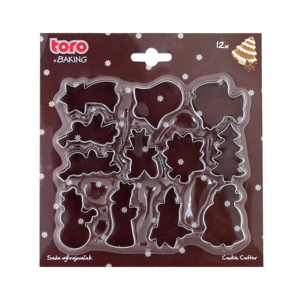 Vianočná sada formičiek. Kovové vykrajovače sú vhodné na cukrovinky, medovníčky, poťahové alebo modelovacie hmoty. Sada obsahuje 12 ks: zvonček, kométa, ryba, anjel 1, anjel 2, čert, Mikuláš, snehuliak, stromček, Santa Klaus, sviece a čečina.