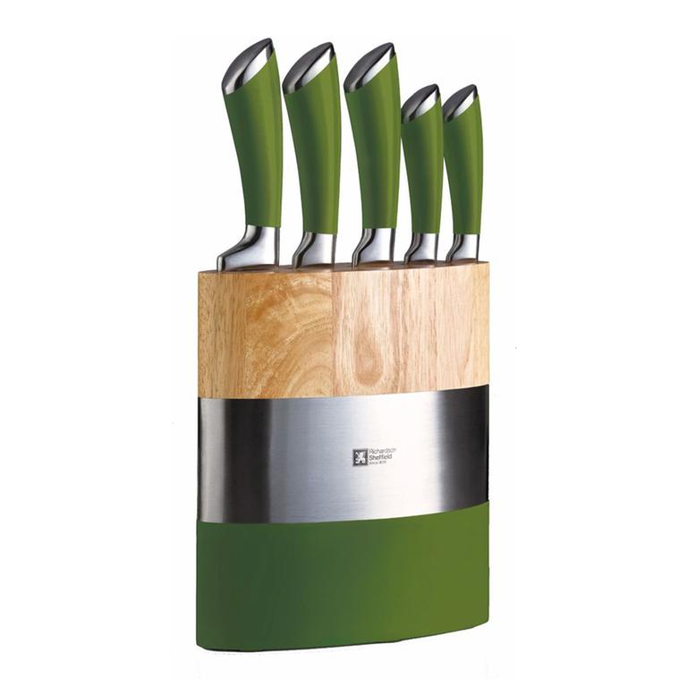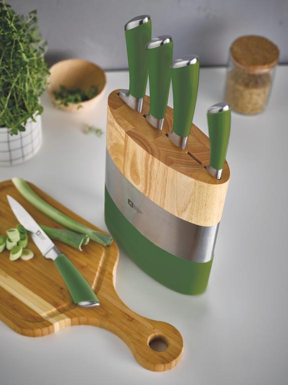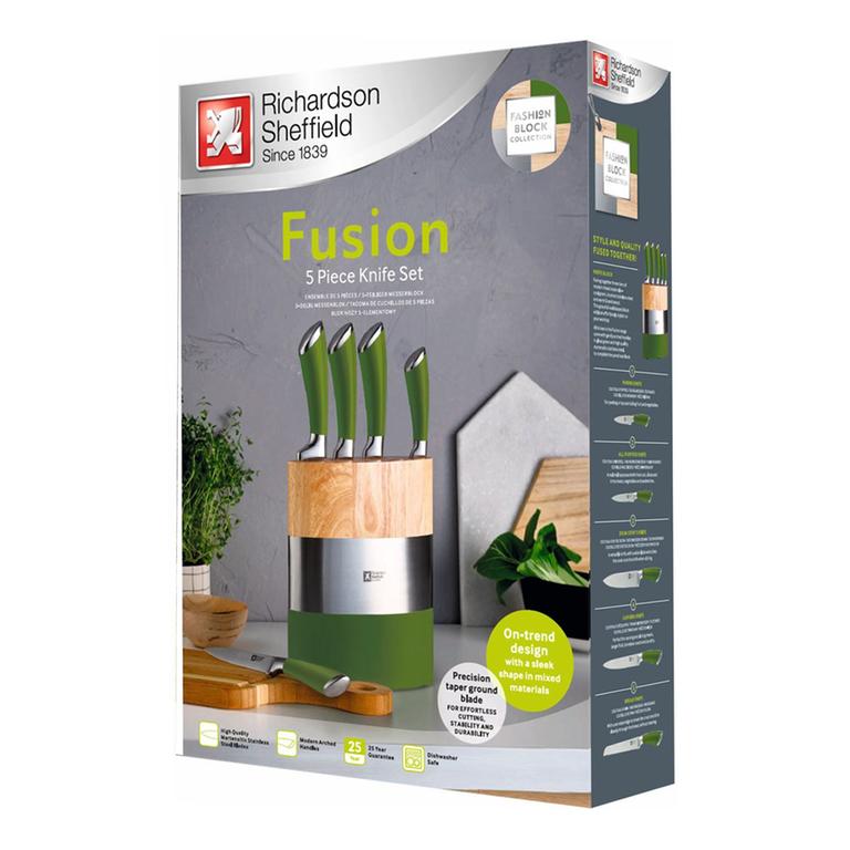 Sada 5 nožov v bloku Richardson Sheffield Fusion so zelenou rukoväťou je špeciálne navrhnutá na každodenné používanie. Dizajnové nože so stojanom od značky Amefa sa hodia do každej modernej kuchyne. Nože sú vyrobené z vysoko kvalitnej nehrdzavejúcej ocele, čepeľ každého noža je extrémne ostrá. Vďaka svojej ľahkej váhe a dokonalému ergonomickému tvaru ponúkajú tieto nože maximálny komfort pri krájaní. Nože sú vhodné aj do umývačky riadu. Blok do umývačky riadu nepatrí. Neponárajte blok na nože ani do vody. Ak je špinavý, jednoducho ho utrite vlhkou handričkou.