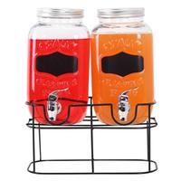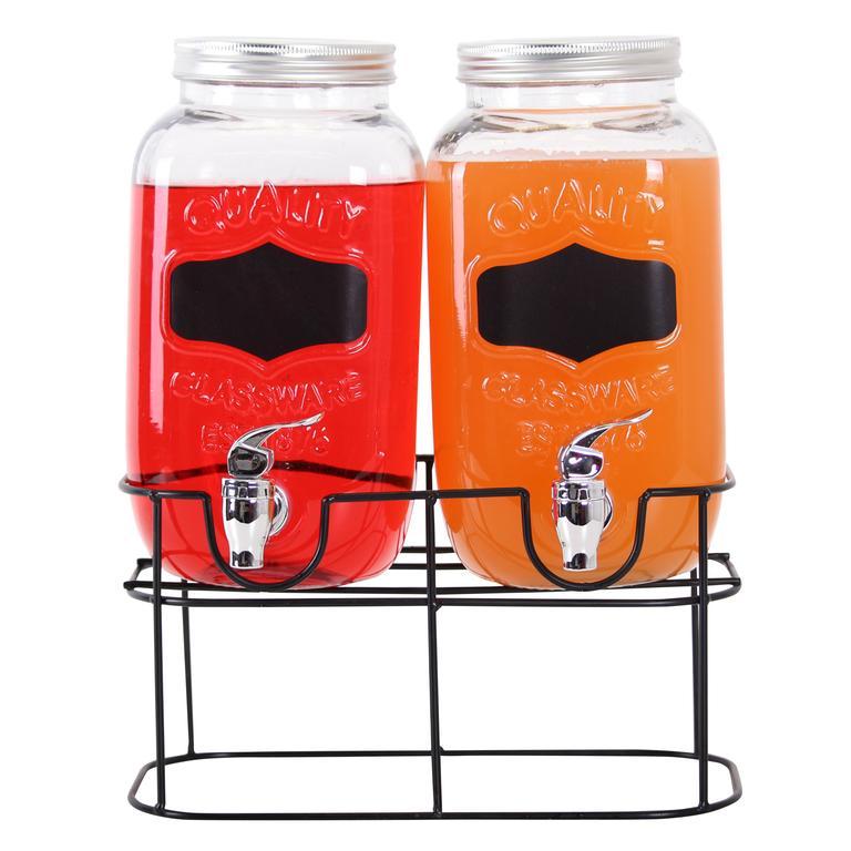Poháre na nápoje so skrutkovacím uzáverom a otočným plastovým kohútikom sú praktickým doplnkom a ozdobou každej párty, oslavy alebo grilovania. Tieto dva poháre sú doplnené kovovým stojanom. Sú vhodné na studené nápoje, ako napr. domáca limonáda, miešané nápoje atď. Objem 2 x 3,5 litra. Materiál - sklo, plast, kov.