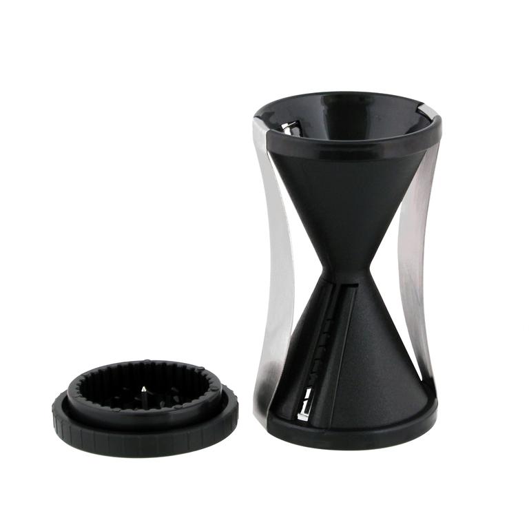 Špirálový krájač na zeleninu. S týmto dekoratívnym krájačom vykúzlite behom chvíle dlhé rezance a špirálky z mrkvy, uhoriek, redkvičiek a inej tvrdšej zeleniny. Krájač krája zeleninu z každej strany v inej hrúbke. Navyše je krájač vybavený otáčacím držiakom, na ktorý jednoducho nabodnete zeleninu a predídete tak poraneniu prstov. Materiál - plast, nerez. Rozmery - 6,8 x 13 cm. Farba čierna.