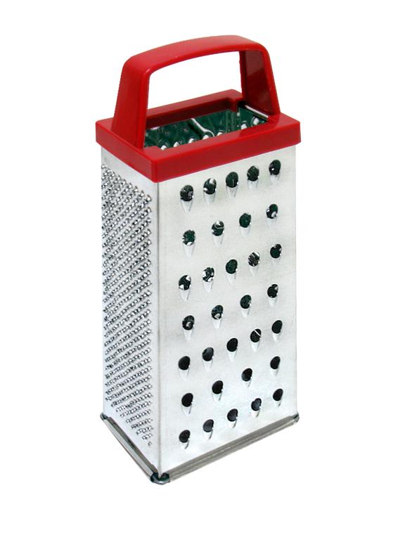 Štvorhranné strúhadlo so základnými funkciami strúhania a pevným držadlom. Možno strúhať na jemno, na hrubo a na plátky. Materiál plast, plech. Farba strieborná, červená. Rozmery 20 x 8,9 cm.