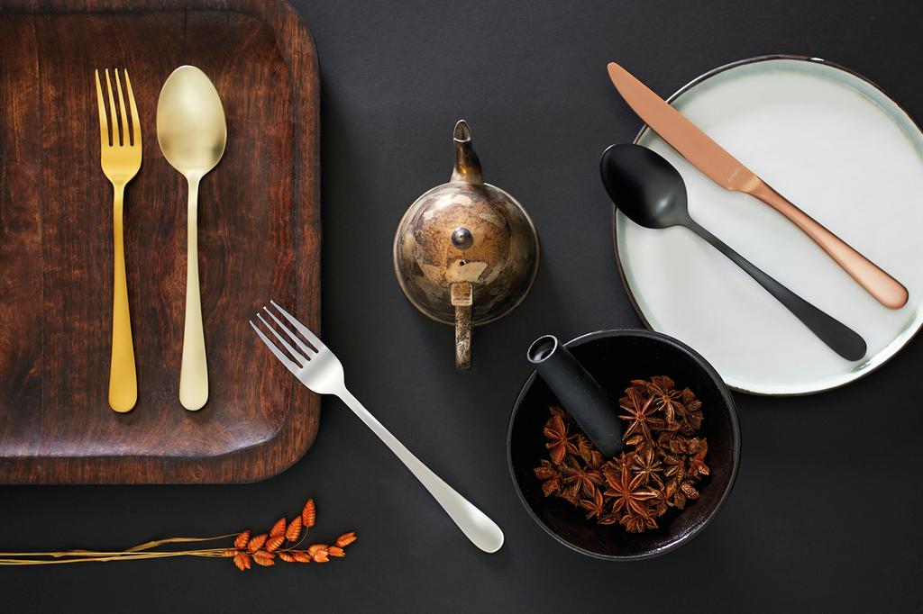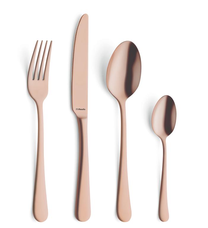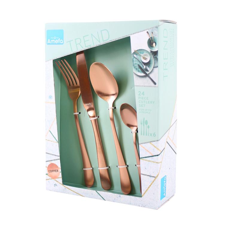 Sada 24 ks príborov AUSTIN je vyrobená z prvotriednej nehrdzavejúcej ocele 18/0, kazetové balenie obsahuje 6 jedálenských nožov, 6 vidličiek, 6 polievkových lyžíc a 6 kávových lyžičiek. Kvalitný príbor pre každodenné použitie v nevšednom modernom dizajne štýl, Vintage, matné prevedenie. Vhodné do umývačky riadu. Farba medená.