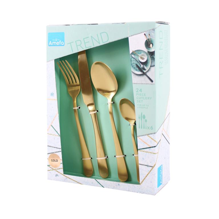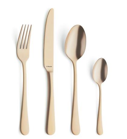 Sada 24 ks príborov AUSTIN je vyrobená z prvotriednej nehrdzavejúcej ocele 18/0. Kazetové balenie obsahuje 6 jedálenských nožov, 6 vidličiek, 6 polievkových lyžíc a 6 kávových lyžičiek. Kvalitný príbor na každodenné použitie v nevšednom modernom dizajne, štýl Vintage, matné prevedenie. Vhodné do umývačky riadu. Farba zlatá.