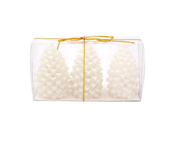 Sada 3 ks vianočných sviečok v tvare šišky. Hodia sa na každý vianočný stôl, kde navodia tú pravú sviatočnú atmosféru. Materiál - parafín. Farba biela.