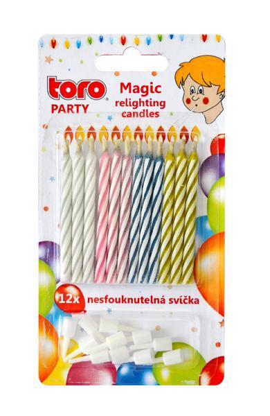 Sviečky na tortu, ktoré nemožno sfúknuť. Vhodné na párty či oslavu narodenín. Balenie obsahuje 12 ks sviečok a 12 ks držiakov na sviečky. Sviečky jednoducho zapichnete do torty.