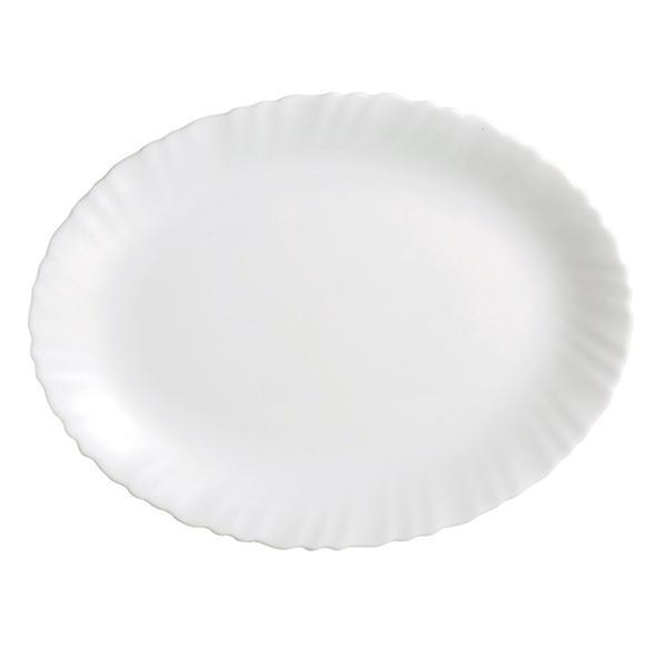 Jedálenský oválny tanier "Titan" je krásny moderný tanier vyrobený z opálového skla. Opálové sklo je tvrdené sklo, nahrádza porcelán a je ťažko rozbitné, veľmi obľúbené. Šírka taniera je 36 cm. Jemne vlnitý okraj. Farba biela.