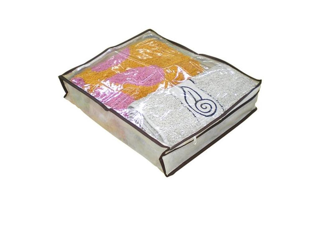 Vkladanie vecí do obalu je možné z prednej strany, ktorá je zapínateľná pomocou zipsu. Čelná strana je potom opatrená priehľadným oknom na zistenie obsahu obalu. Úložný vak je veľmi šikovným a skladným pomocníkom na úschovu textílií alebo perín, napr. pod posteľou. Rozmery 35 x 30 x 8 cm.