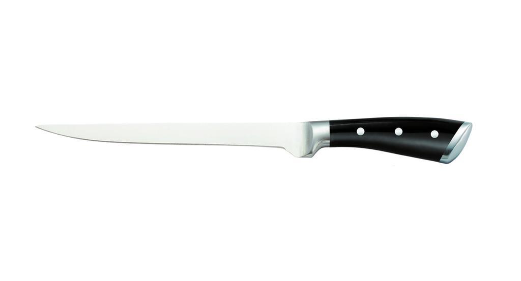 Nôž vykosťovací z nového radu Provence Gourmet vás zaujme hneď na prvý pohľad. Je vyrobený z vysoko kvalitnej lesklej nerezovej ocele, protišmyková pogumovaná rukoväť je dutá s 3 nerezovými nitmi. Vďaka nej sa nôž dobre drží a nešmýka sa z ruky. Vykosťovací nôž je vhodný predovšetkým na vykosťovanie mäsa. Možno ho umývať v umývačke riadu. Dĺžka čepele 17 cm. Farba strieborná, čierna rukoväť.