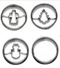 Súprava formičiek 4 ks, tvar koliesko s vianočným motívom. Vhodné na cukrovinky, medovníčky, poťahové alebo modelovacie hmoty. Vykrajovače sú od českého výrobcu a spĺňajú všetky predpísané normy. Vyrobené z pocínovaného plechu. Priemer 4 cm. P>