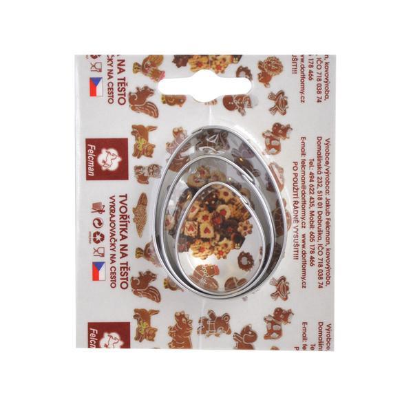 Veľkonočné formičky na cukrovinky v tvare vajíčok. Vyrobené z nerezového plechu. Vykrajovače sú od českého výrobcu a spĺňajú všetky predpísané normy. Balenie 3 ks rôznych veľkostí vajíčok.
