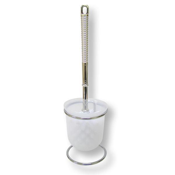 Súprava na toaletu - štetka s kovovým držadlom v plastovej nádobe na kovovom stojane. Rozmer stojanu - 13,5 x 10 cm, rozmer štetky - 33 x 8,3 cm. Materiál - plast, pochrómovaný kov.