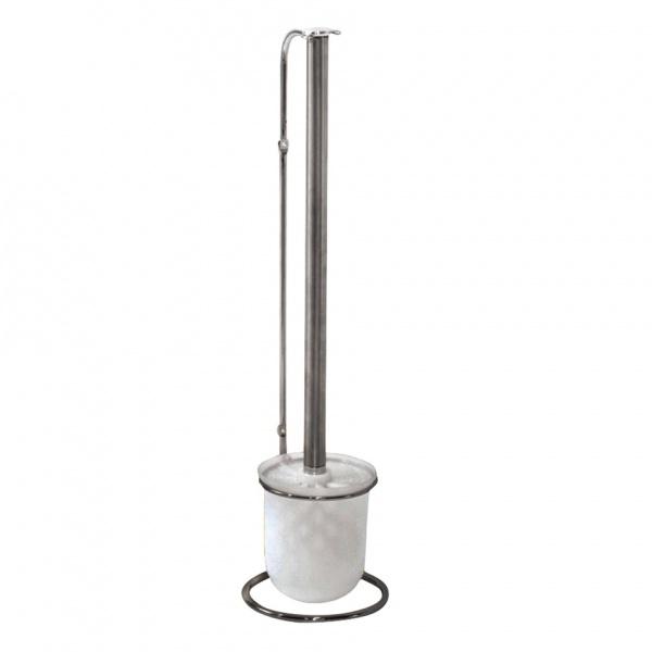WC súprava na toaletu, štetka s kovovým držadlom v bielej plastovej nádobe na kovovom stojane. Materiál - plast, pochrómovaný kov. Rozmery stojanu 49,7 x 10,5 cm. Rozmery štetky 47 x 7,8 cm. Farba - modrá, biela, strieborná